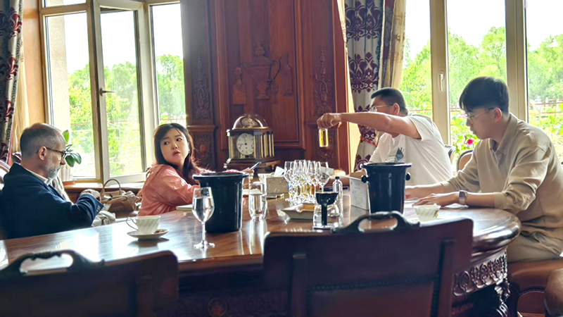近日,在芬河帝堡酒庄内,来自法国的资深品酒师与芬河帝堡酒庄的工作人员齐聚一堂,共同品鉴酒庄所产的白兰地酒。